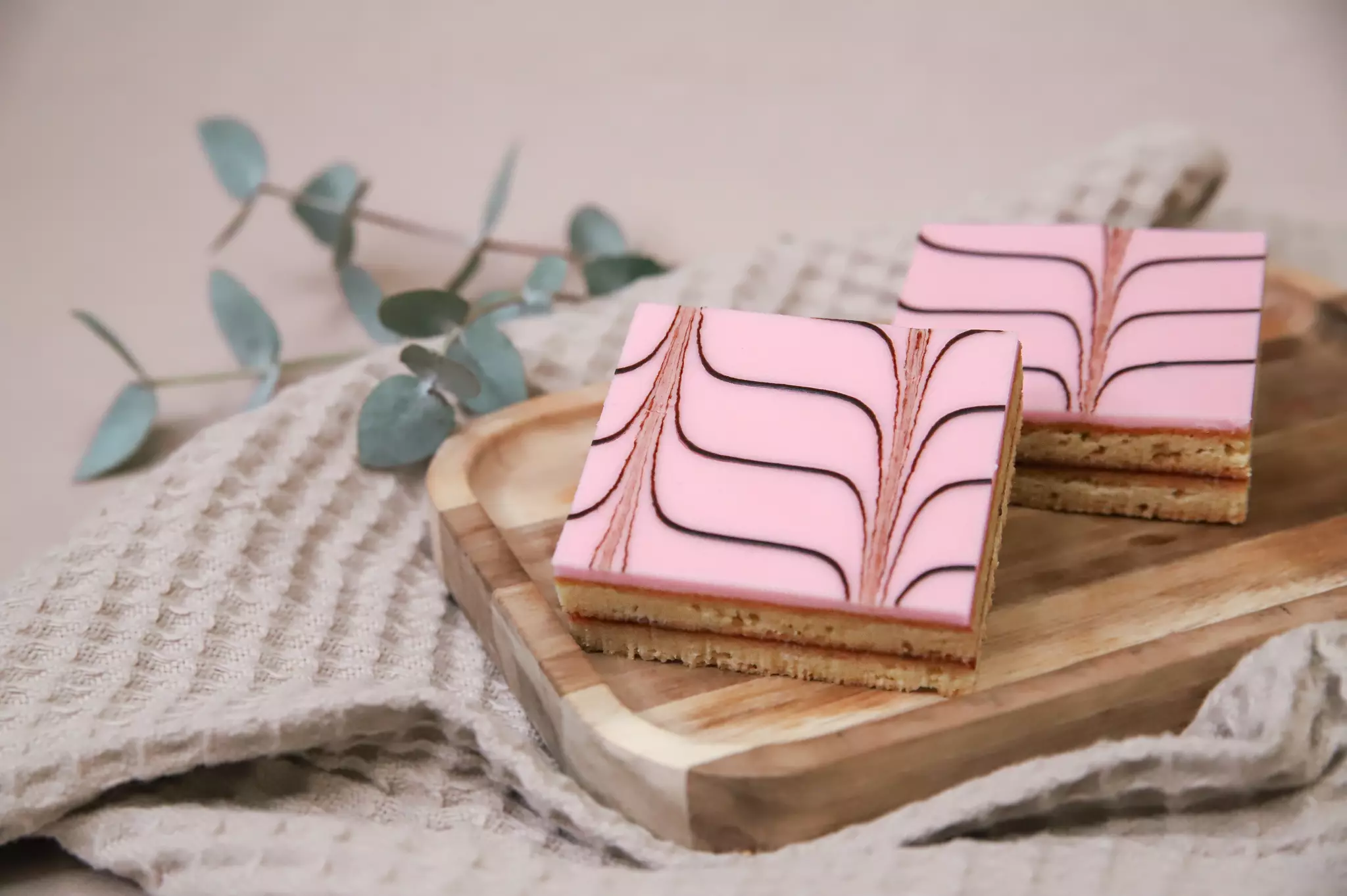 Vehnäjauho, laktoositon voi, sokeri, kananmuna, leivinjauho, suola, pomada [glukoosisiirappi, vesi, väri (E120)], vadelmatäyte [vadelma, muunnettu maissitärkkelys (E1422), hyytelöimisaine (E440), happamuudensäätöaineet (E220, E333), säilöntäaine (E202), aromi], suklaaraita [sikeri, kasviöljy ja -rasva (osittain kovetettu), kaakaojauho, herajauhe, emulgointiaineet (E492, E322), vanilliiniaromi.
