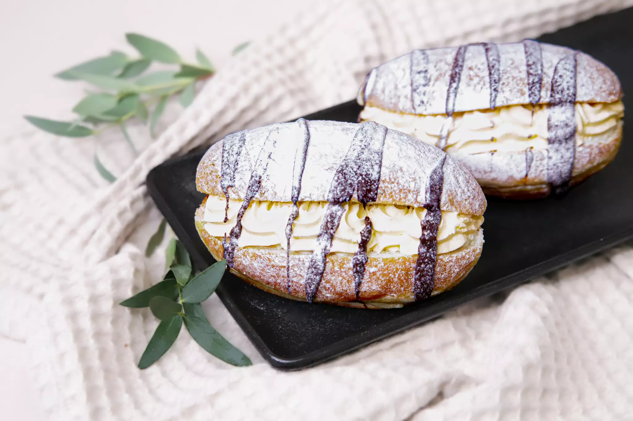 Vehnäjauho, vesi, sokeri, kasviöljyt/-rasvat (palmu, rapsi, kookos), emulgointiaine (E471) (kasvirasvasta), aromi, väri (E160a), laktoositon kerma (maito), ananas-greippitäyte [ananas (14 %), greippi (4 %), sakeuttamisaineet (E440, E1442 peruna), happamuudensäätöaineet (E330, E333), säilöntäaine (E202), aromi], kananmuna, hiiva, emulgointiaine (E481), happamuudensäätöaine (E170, E341), rapsiöljy, suola, kardemumma. Päällä suklaaraidat [laktoosi, herajauhe (maito), emulgointiaineet (E492, E322) (soijalesitiini), aromi, väri (E120), kaakaojauhe].