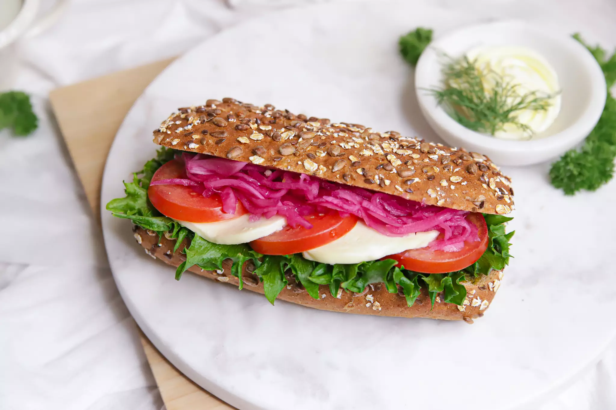 Täyte: Mozzarella [maito (Sveitsi), happamuudensäätöaine (E330), laktaasi, mikrobiologinen juoksute], pesto [auringonkukkaöljy, tiivistetty basilika, suola, maissitärkkelys, valkosipuli, viinietikka, fruktoosi, happamuudensäätöaineet (E270, E330)], tomaatti, salaatti, marinoitu punasipuli [etikka, sokeri, vesi.] Paino 200 g