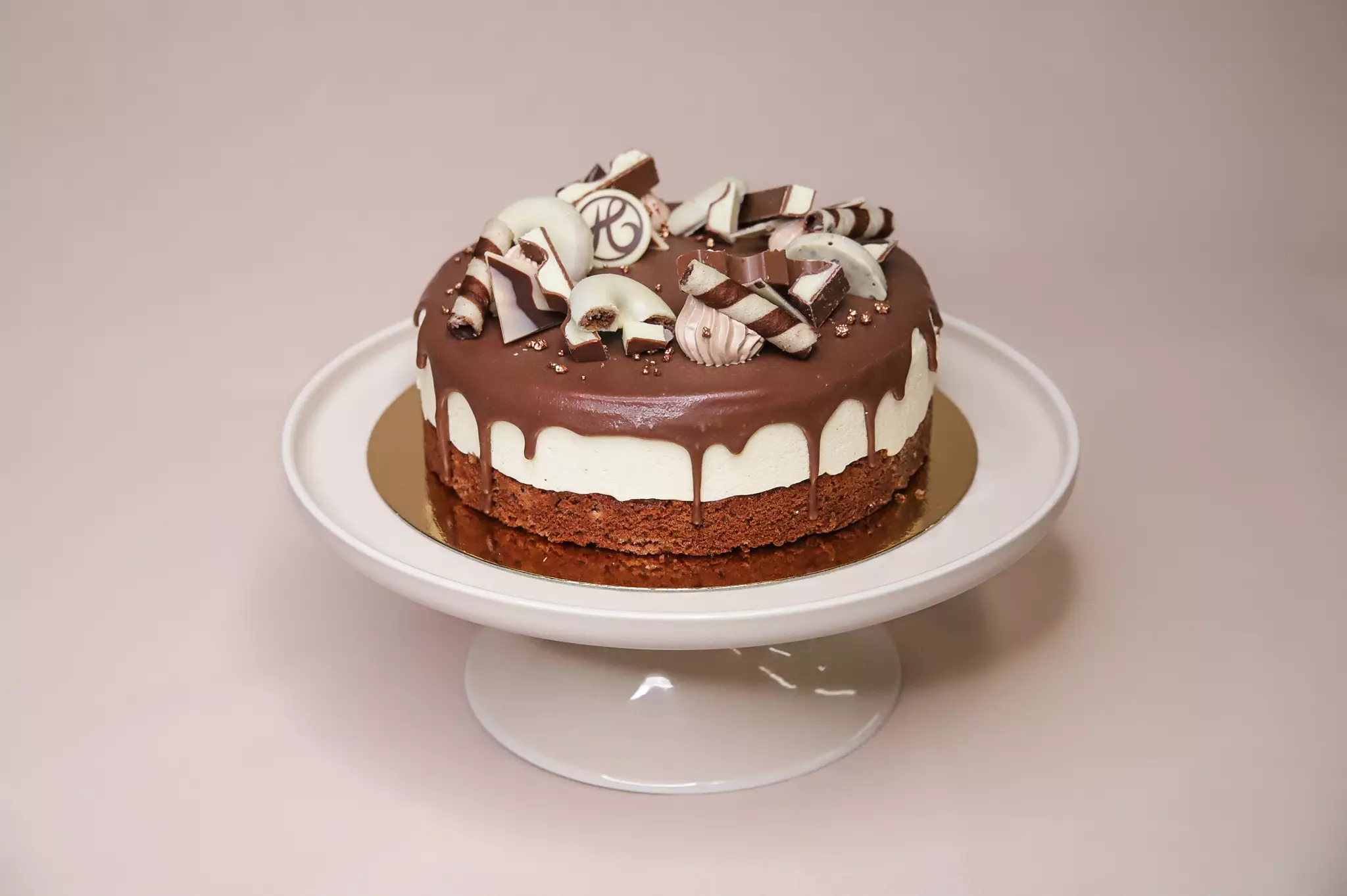 Kakkupohja [vehnäjauho, kananmuna, sokeri, laktoositon voi, suola, hapate, happamuudensäätöaine (E500), laktoositon kerma, leivinjauhe, vaniljasokeri, kaakaojauhe], vaniljamousse [laktoositon kerma, vesi, sokeri, glukoosi-fruktoosisiirappi, muunnettu tärkkelys (E1442), värit (E516, E160a, E101), stabilointiaineet (E460, E466), suola, säilöntäaine (E202), hapot (E330, E332ii), aromi, glukoosisiirappi, sokeri, makeutettu maitotiiviste, vanilja (3%), aromit, muunnettu tärkkelys, karamellisoitu sokeri, happamuudensäätöaine (E330), suola, glukoosi, sokeri, liivate, suola, luontainen vanilja-aromi, sokeri, tärkkelys (peruna), bourbon vaniljauute], kreemi (laktoositon voi, tomusokeri, vaniljasokeri), suklaakuorrute (laktoositon kerma, maitosuklaa, tumma suklaa).