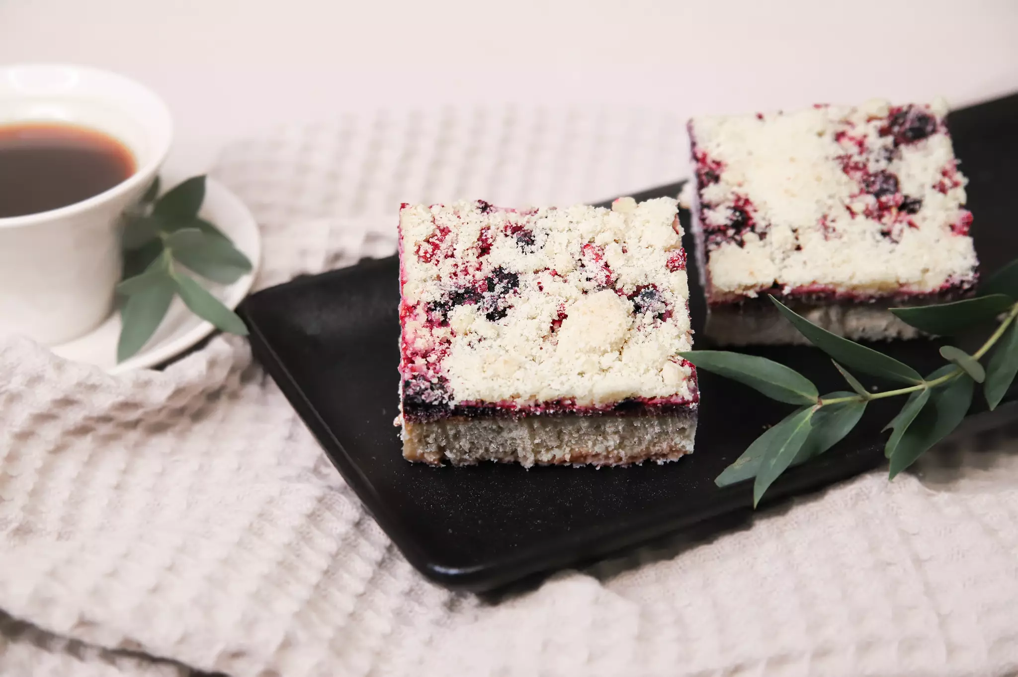 Vehnäjauho, laktoositon voi, leivinjauhe, margariini [kasviöljy ja -rasva (osittain kovetettu), vesi, suola, aromi], sokeri, kananmuna, laktoositon maitojauhe, mustikka ja vadelma.