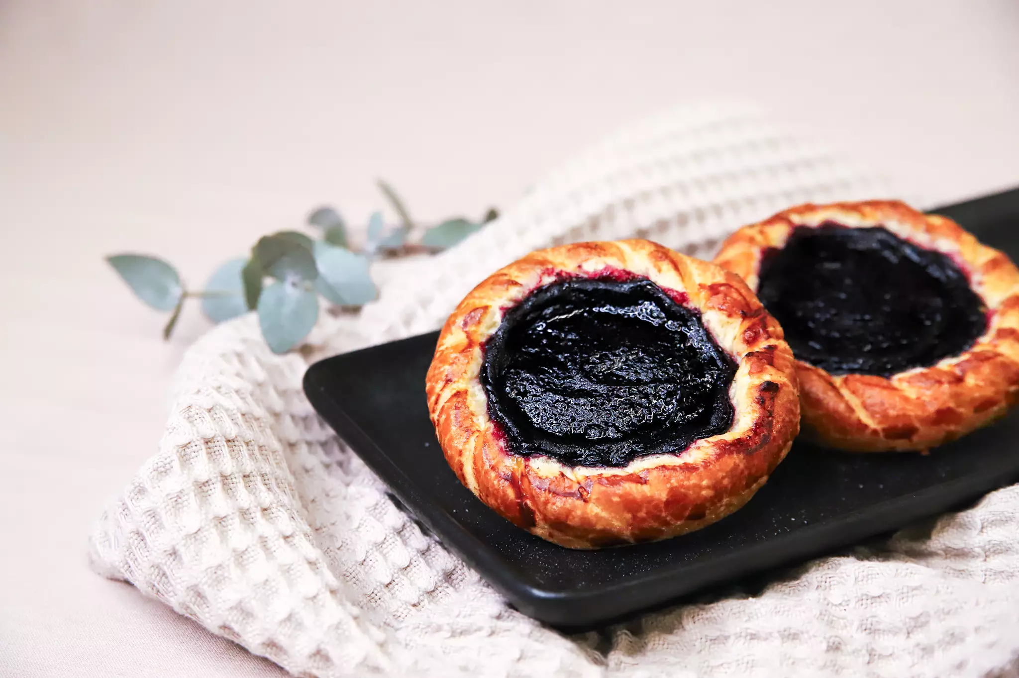 Vehnäjauho, mustikkahillo 40% [mustikka (35 %), muunettu tärkkelys (E1422), sakeuttamisaine (E440), säilöntäaine (E202), stbilointiaine (E509), happamuudensäätöaine (E330)], laktoositon voi, vesi, sokeri, kasviöljyt/ -rasvat (palmu, rapsi, kookos), emulgointiaine (E471) (kasvirasvasta), aromi, väri (E160a), kananmuna, hiiva, emulgointiaine (E481), happamuudensäätöaine (E170, E341), suola, kardemumma.