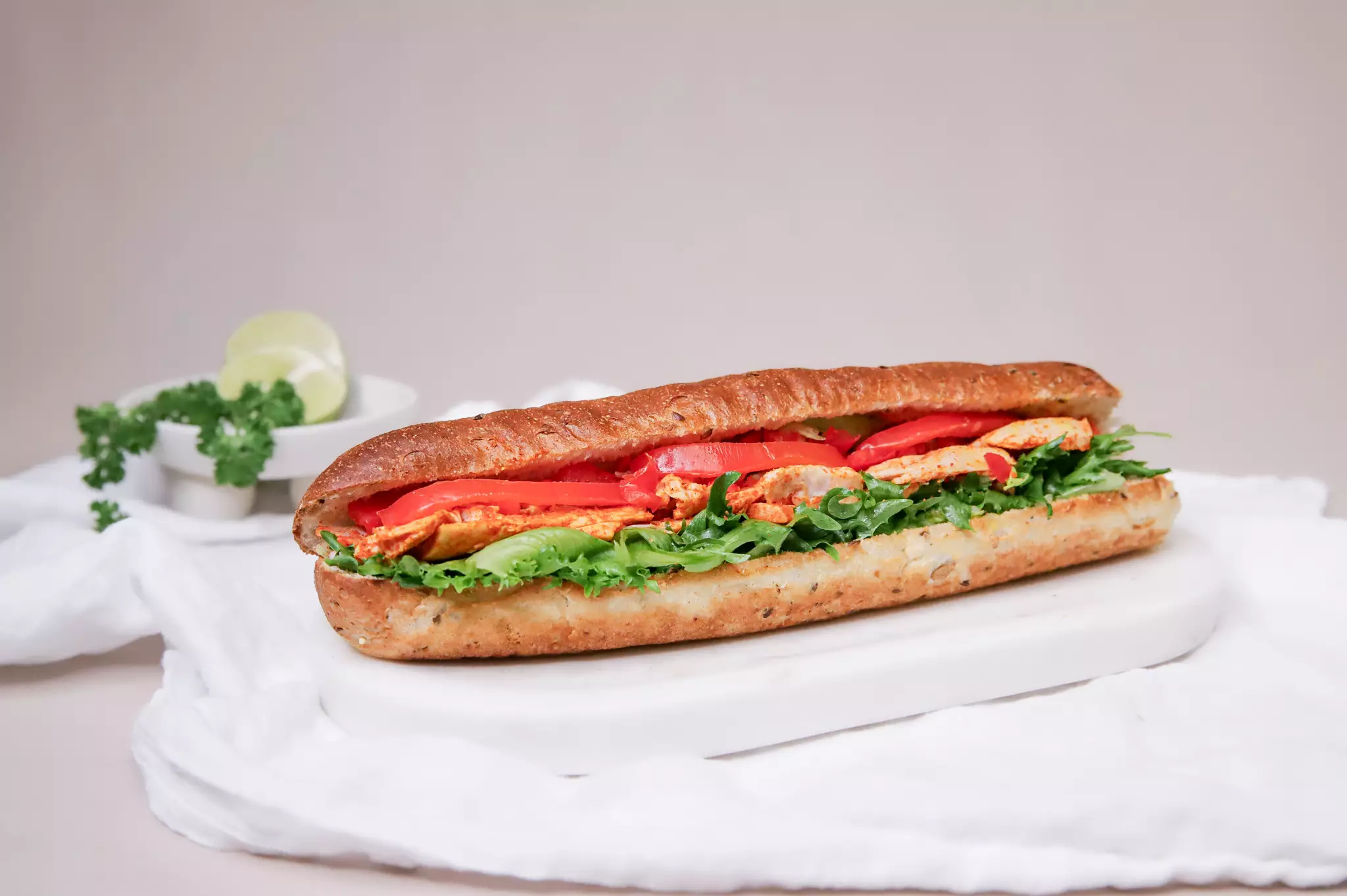 Täyte: Broiler [broilerinliha (suomi), vesi, perunatärkkelys, siipikarjanrasva, jodioitu suola, perunakuitu, hiivauute, sokeri, stabilointiaine (E450), valkopippuri, hapettumisenestoaine (E301), säilöntäaine (natriumnitriitti)], mangomajoneesi [majoneesi (rapsiöljy (EU), vesi, kananmunankeltuainen, väkiviinaetikka, sokeri, suola, sinapinsiemen, säilöntäaineet (natriumbentsoaatti, kaliumsorbaatti), sakeuttamisaineet (ksantaanikumi, guarkumi), aromi, valkopippuri), mango, curry, kurkuma], salaatti, paprika, mauste [paprika, korianteri, sipuli, kurkuma, sarviapila, valkosipuli, sokeri, fenkoli, cayennepippuri, juustokumina, mustapippuri, paakkuuntumisenestoaine (E551), sitruunamehujauhe, väri (paprikauute)]. Paino 250g