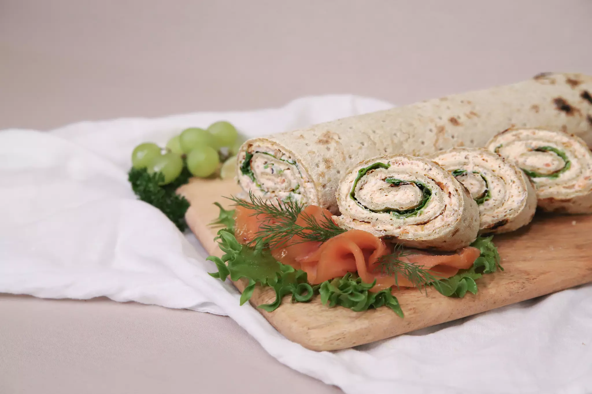 TÄYTE: Kylmäsavulohitäyte (Kylmäsavulohi (lohi (norja), suola, happamuudensäätöaine (E267)), tuorejuusto (Pastöroitu kirnumaito ja kerma, laktaasientsyymi, hapate), vispikerma (kerma, stabilointiaine (karrageeni)) sitruunatäysmehu, mustapippuri) ja Salaatti.